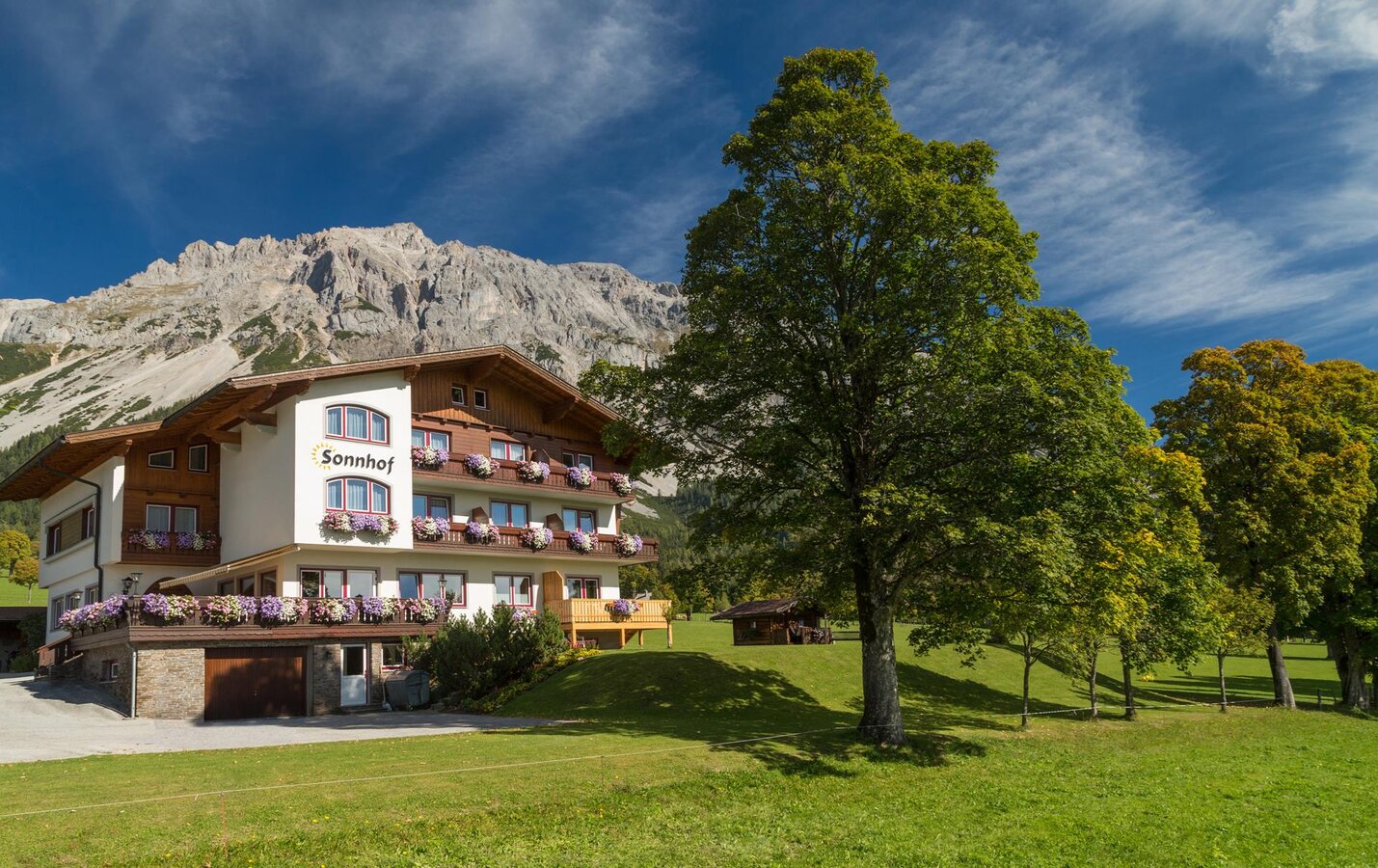 Bei uns am Sonnhof auf 1225 Metern Seehöhe vereinen sich Gastfreundlichkeit, Gemütlichkeit und Komfort. Unsere gemütliche Pension befindet sich zwischen Ramsau Ort und Rittisberg. Genießen Sie den Blick auf die Schhladminger Tauern (Planai, Hochwurzen, Reiteralm) und den Dachstein. Der Rittisberg und die anderen Skilifte in der Ramsau sind in unmittelbarer Nähe. Die Skiberge Planai, Hauser Kaibling, Reiteralm, Hochwurzen und Dachsteingletscher sind mit dem Auto oder Skibus in weniger als 15 Minuten erreichbar. Mit dem Ski Amadé Ticket stehen Ihnen weitere 870 Pistenkilometer zur Verfügung! Die Loipen von Ramsau am Dachstein, die Skischulen, Ramsau Beach, Rittisberg, Wanderwege am Ramsauer Plateau und Dachstein Almgebiet liegen nur wenige Meter von der Pension Sonnhof entfernt. In den Wintermonaten verwandelt sich Ramsau in ein wahres Winterparadies. Genießen Sie die klare Luft der Ramsauer Bergwelt und nutzen Sie die vielfältigen Winteraktivitäten. In etwa 20 Gehminuten erreicht man den Ramsauer Ortskern, wo sich auch das WM Stadion Ramsau am Dachstein sowie das Nordische Trainingszentrum befindet, stets begleitet durch das atemberaubende Panorama des Dachsteinmassivs. Wohnen Sie in neu renovierten Doppelzimmern, Familienzimmern oder Ferienwohnungen. Im Zimmer und Appartement: Balkon mit Bergblick, Flachbildschirm & Sat-TV (auch HD), WLAN "for free", Safe, Telefon und Haarfön. Die Zimmer sind bequem mit dem neuen Etagenlift erreichbar! Lassen Sie sich von uns verwöhnen und genießen Sie unser reichhaltiges Frühstückbuffet. Hier am Sonnhof können Sie sich sowohl im Haus, wie auch außerhalb sportlich betätigen. Langlaufen, Skifahren, Wandern, Schneeschuhwandern, Skitourengehen, Nachtrodeln am Rittisberg, Baden im Hallenbad Ramsau (1 km), und Vieles mehr - das ist der Luftkurort Ramsau am Dachstein inmitten der Region Schladming - Dachstein. Immer einen Ausflug wert sind auch Filzmoos bzw. die Höhenloipe Rossbrand mit 360 Grad Rundumblick vor der Kulisse der Bischofsmütze im Salzburger Land. TIPP: Buchen Sie als Hausgäste im Sonnhof einen Skikurs (Alpin oder Langlauf) bei der Schischule Ramsau ! Entspannen Sie sich danach in unserer hauseigenen Sauna und tanken Sie wieder neue Energie. Ihre Gastgeber Familie Perner