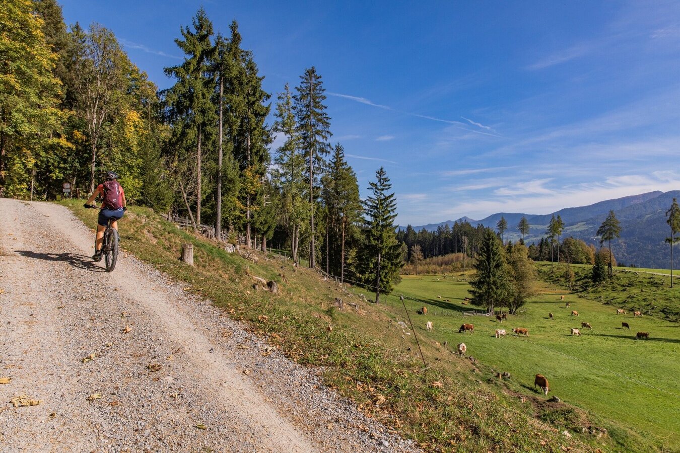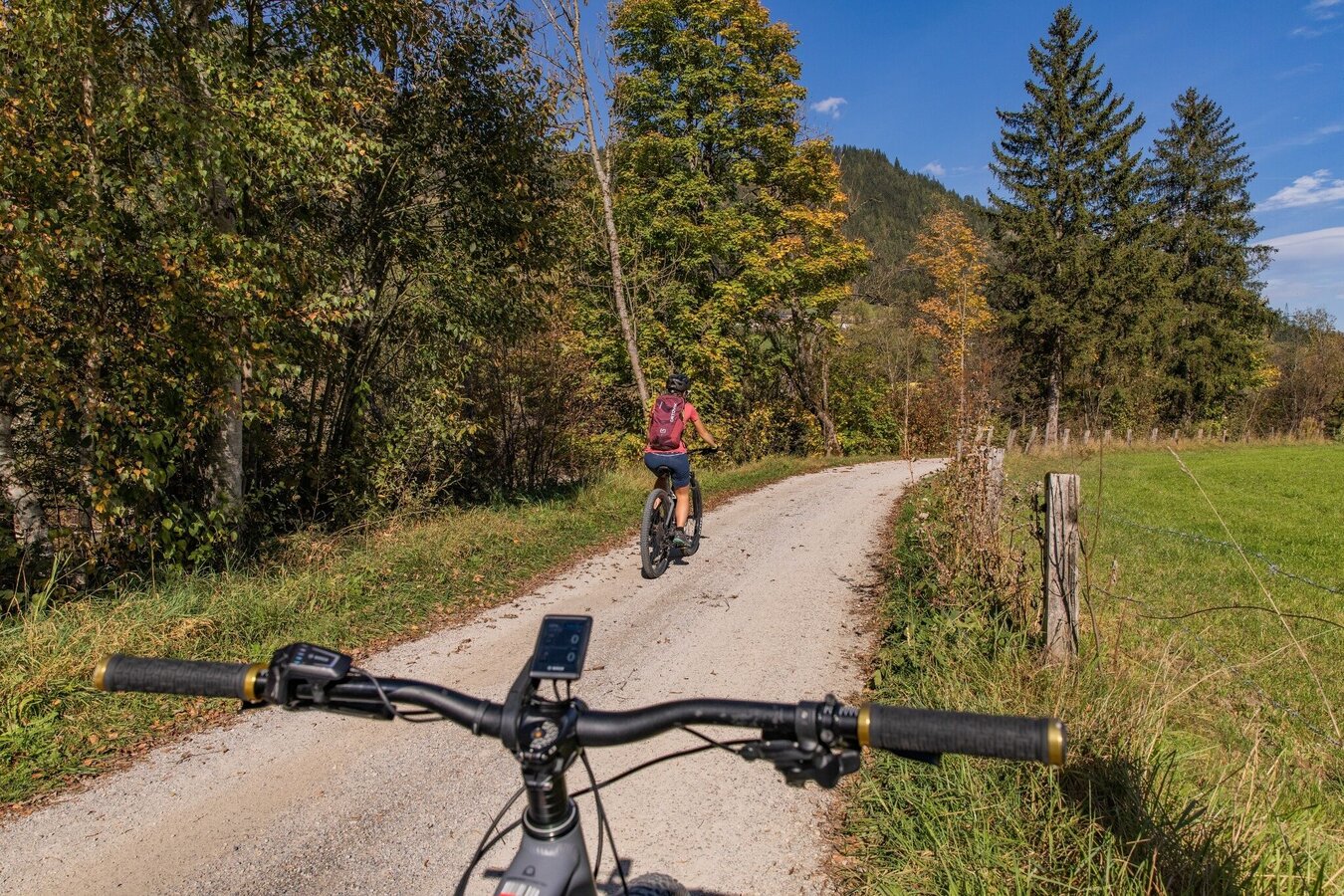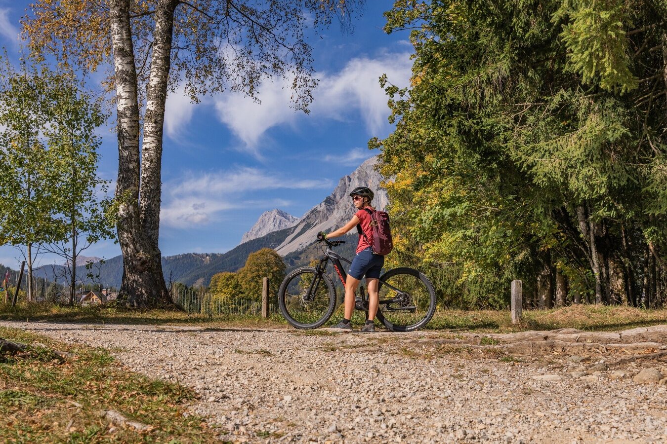 Nach kurzen Asphaltpassagen führt die Runde abwechselnd über Forstwege und schmale, aber einfach fahrbare Pfade durch Ramsau am Dachstein.
