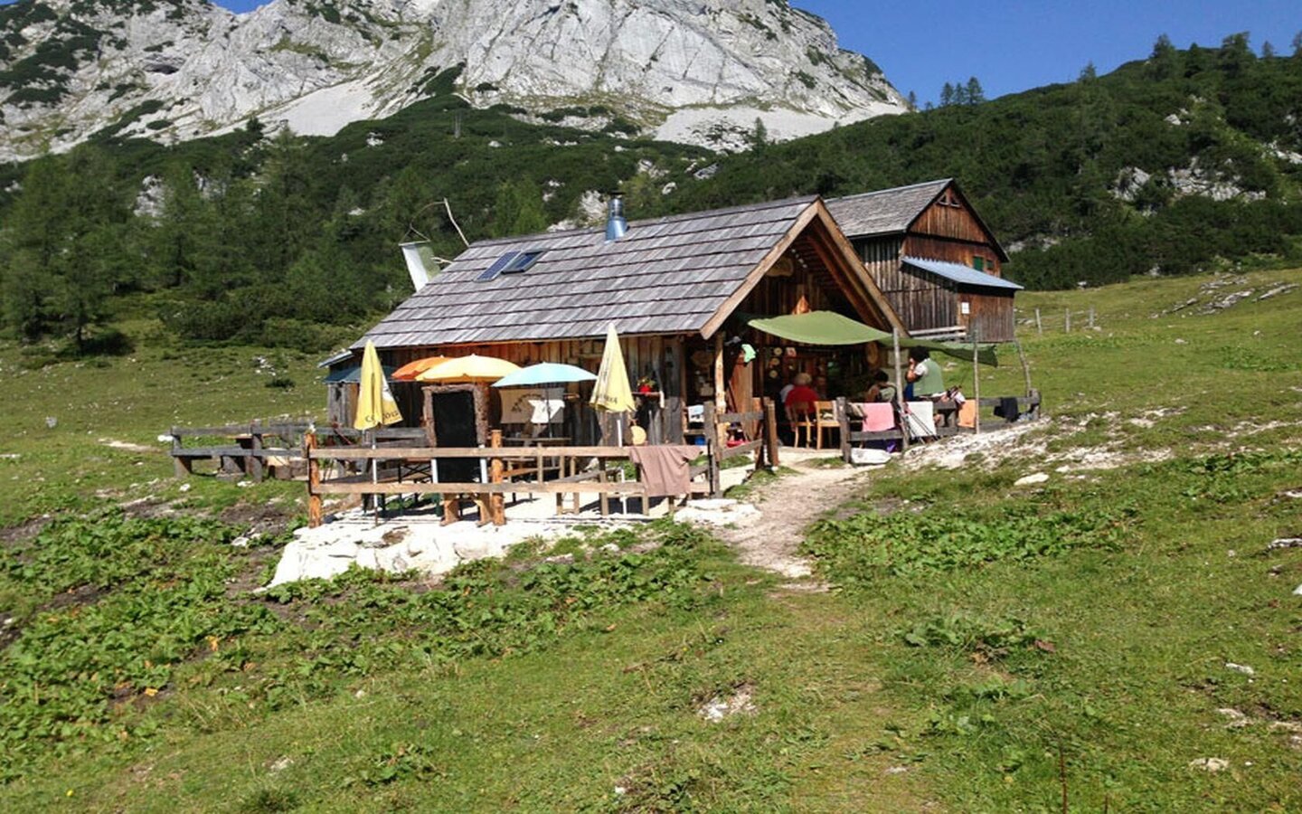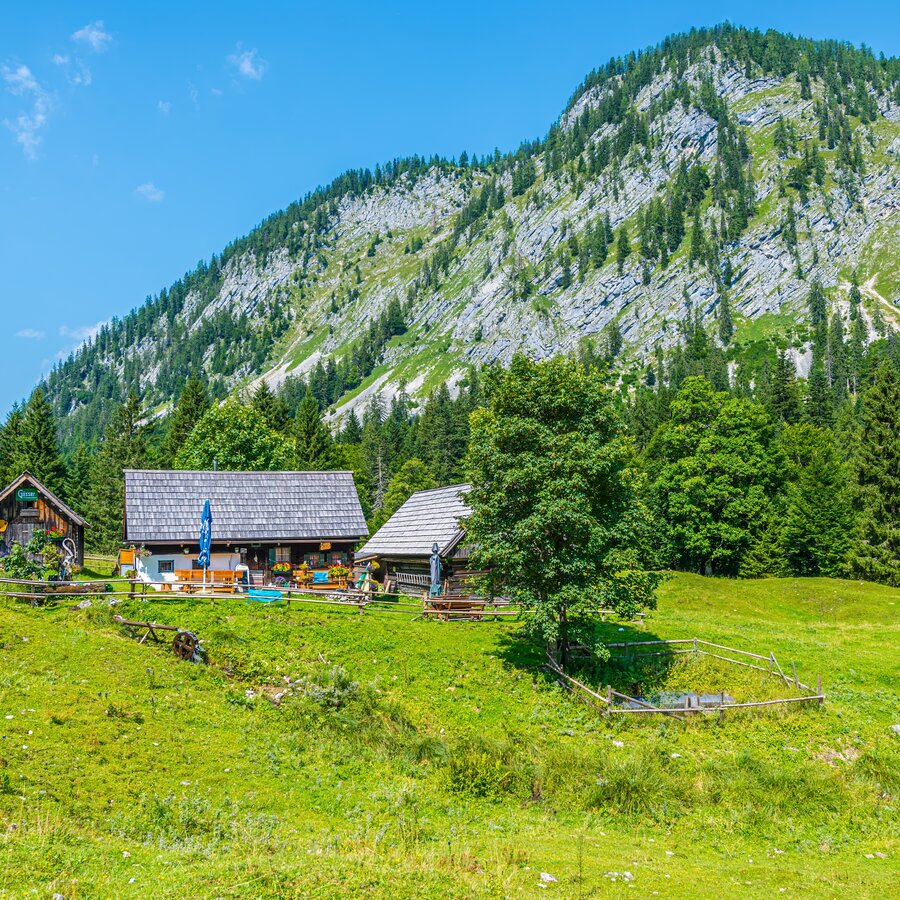 Ostwärts geht es weiter am Weg #218, entlang am Südufer des malerischen Steirersee und über einen kleinen Sattel hinüber zum etwas kleineren Schwarzensee. Kurz nach dem See schließt von Süden der Weg #216 zum Weg #218 auf und bald darauf erreichst Du die Leistalm. Hier kannst Du in der "Wie Dahoam Hittn" einkehren. Von der Leistalm geht es auf dem Weg #218 weiter zur Interhütte (Einkehrmöglichkeit) und von dort dann hinab ins Grimmingtal, wo Du auf den Weg #2 triffst. Diesem folgst Du nun talauswärts in die Gnanitzalm, wo du bei der Johnsleitner Hütte und der Hechlhütte einkehren kannst. Von dort geht es nun nach Westen talauswärts zum Ausgangspunkt deiner Tour. Auf dem Weg kommst Du auch noch an der Böhmhütte vorbei, wo Du ebenfalls einkehren kannst.