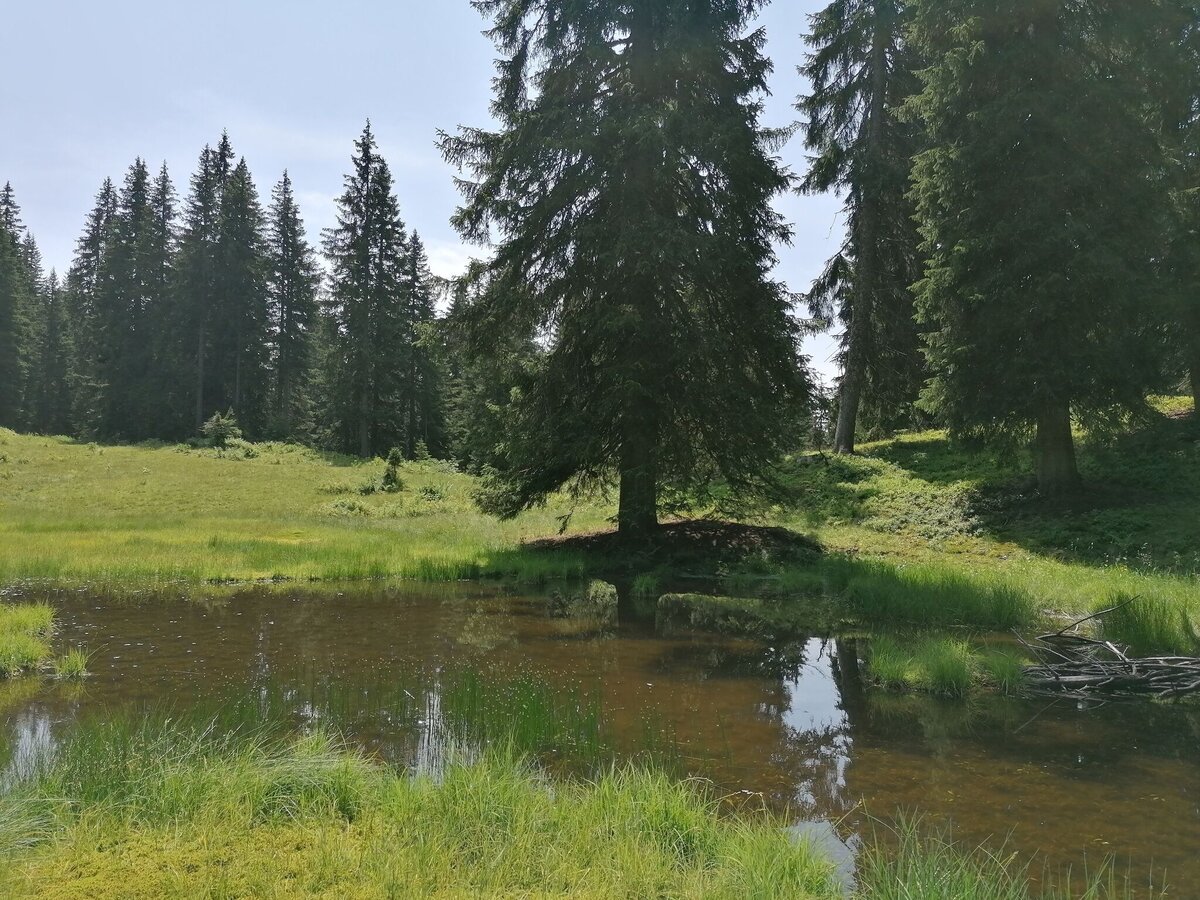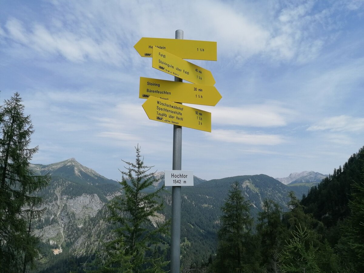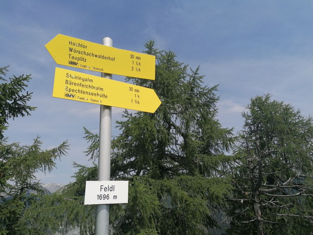 Die Tour beginnt beim Parkplatz der Spechtenseehütte. Rechts gehst du weiter zum Hof Mojer und über den markierten Waldweg rauf zur Stoiringalm. Du wendest dich nach rechts und gehst den Forstweg entlang bis zur letzten Hütte. Dahinter links am Waldweg und über den Steig hinauf bis aufs Feldl. Das Gipfelkreuz und das Bankerl oben laden förmlich zum Rasten ein. Ein faszinierender Ausblick auf die umliegenden Berge, inklusive Hochmölbing, Hochtausing, Hechelstein und Grimming. Weiter gehts nach Westen und der Markierung folgend über Hochtor hinunter zum Wörschachwalderhof. Über den Waldweg zum idyllischen Spechtensee und zurück zum Ausgangspunkt.