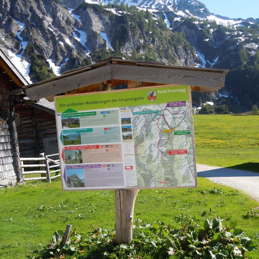 Der Weg verläuft von der Ursprungalm nach Westen zum Bächlein des Preuneggbaches. Während für ambitionierte Wanderer und Bergsteiger der Weg danach rechts zum Brotrinnl und zur Steirischen Kalkspitze (5-6-stündige Tour, schwer) abzweigt, führt der Ursprungalm-Rundweg links unterhalb der imposanten Flanken der Steirischen Kalkspitz ein einem Kreis rund um den Almboden der Ursprungalm zurück zum Ausgangspunkt.