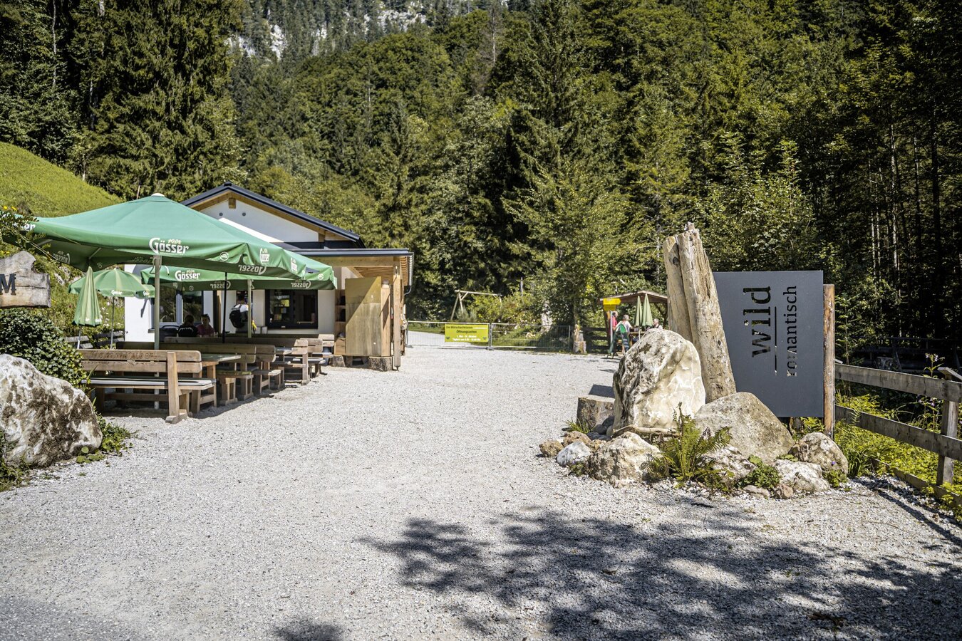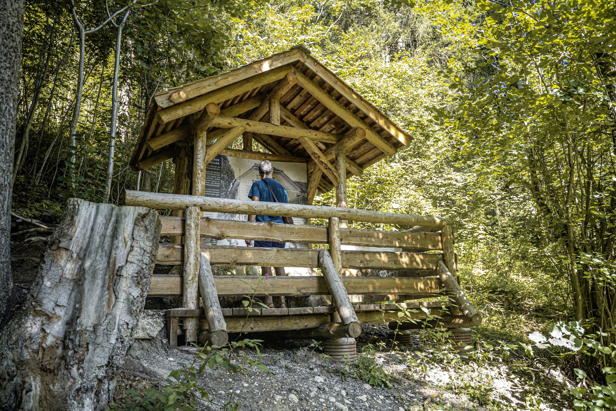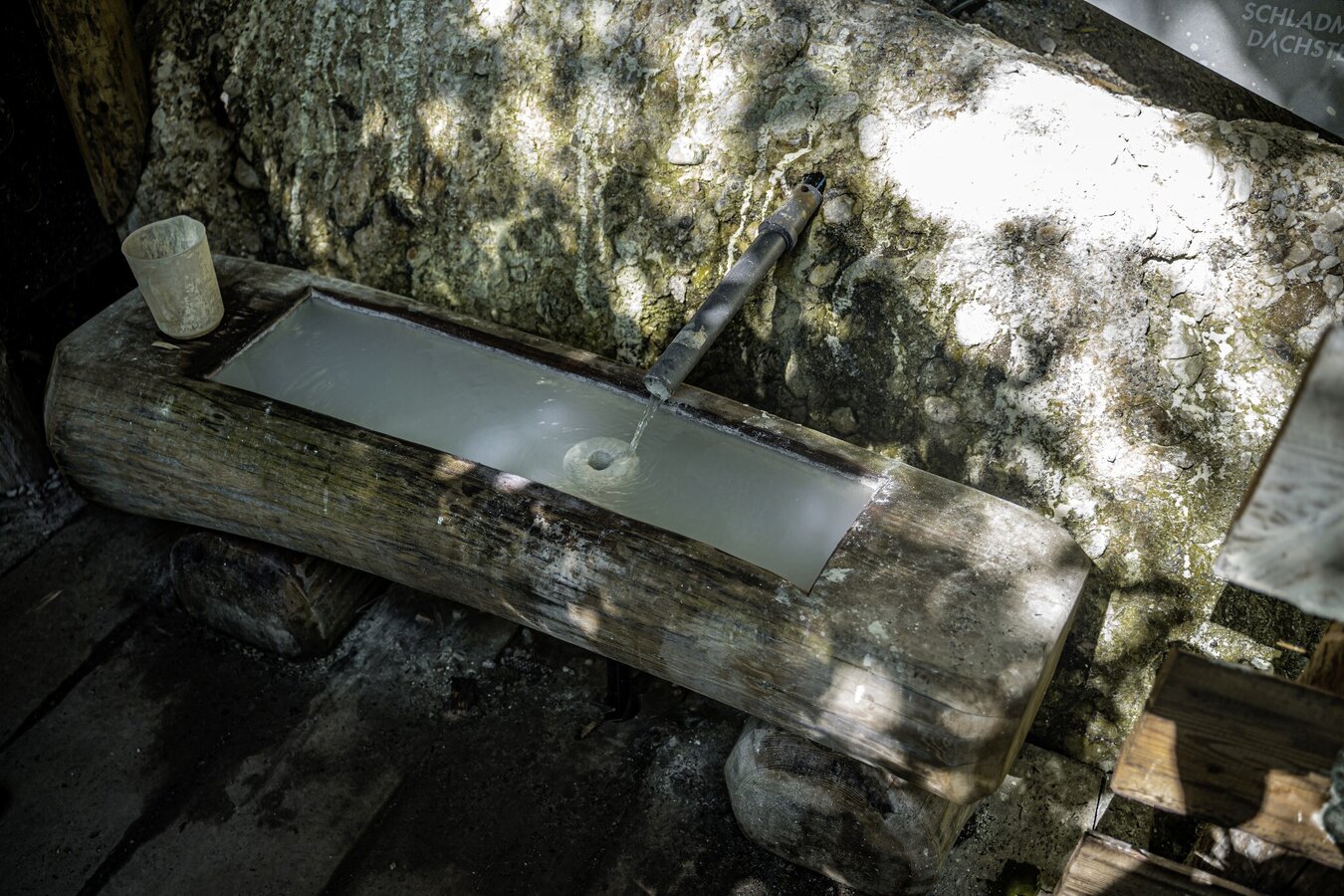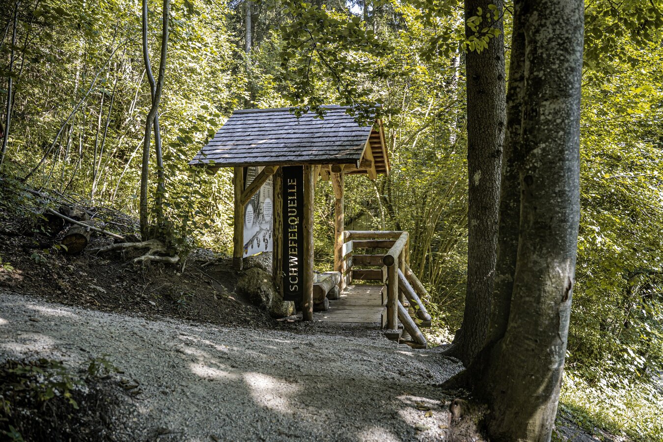 Nun geht es weiter bis zum Kiosk in der Wörschachklamm. Wenn du vom Vorplatz aus rechts abbiegst, gelangst du zu einem breiten Weg, der dich den Osthang des Klammausgangs hinaufführt. Dabei spazierst du erst wieder nach Süden bis zu einer Kehre. In deren Nähe zweigt der Weg zur Burgruine Wolkenstein ab. Du folgst weiter dem breiten Weg, der dich nun wieder taleinwärts nach Norden führt. Hier umgibt dich ein wunderschöner Buchenmischwald, der dir immer wieder kleine Ausblicke ermöglicht. An der Forstweggabelung geht es für dich geradeaus weiter. Kurz darauf folgst du rechts dem Weg hinauf zur Schwefelquelle, die du schon wenige Meter nach der Abzweigung erreichst.