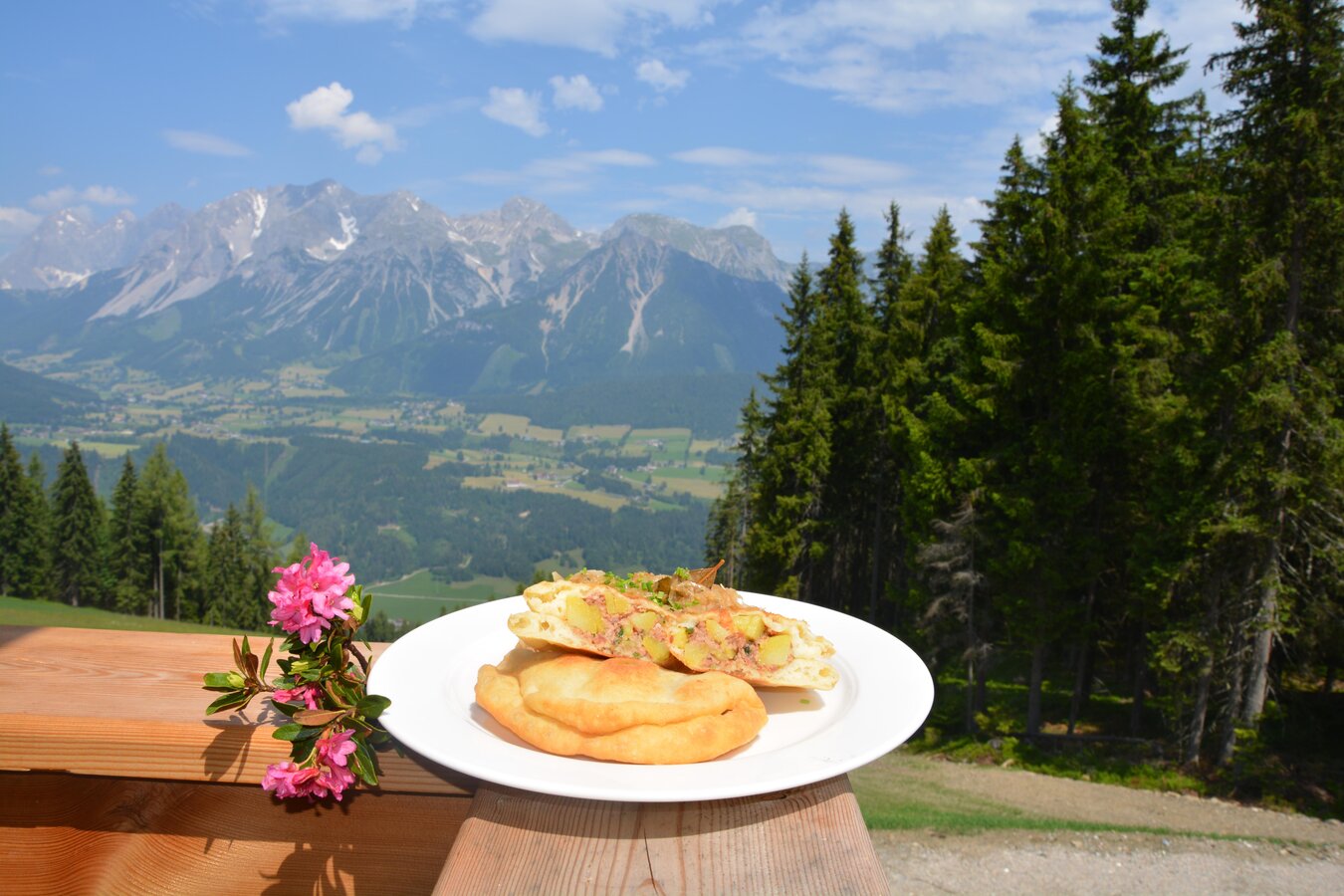 Genießt die herrliche Aussicht auf das Dachsteinmassiv und das obere Ennstal – auf 1.300 m Seehöhe!