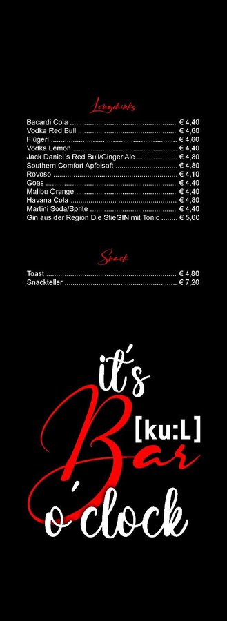 Die Bar im Kunst- und Kulturhaus Öblarn - kU:L - ist ein beliebter Treffpunkt bei Jung und Alt mit leckeren, selbstgemachten Cocktails und eine tollen Auswahl von Spirituosen.