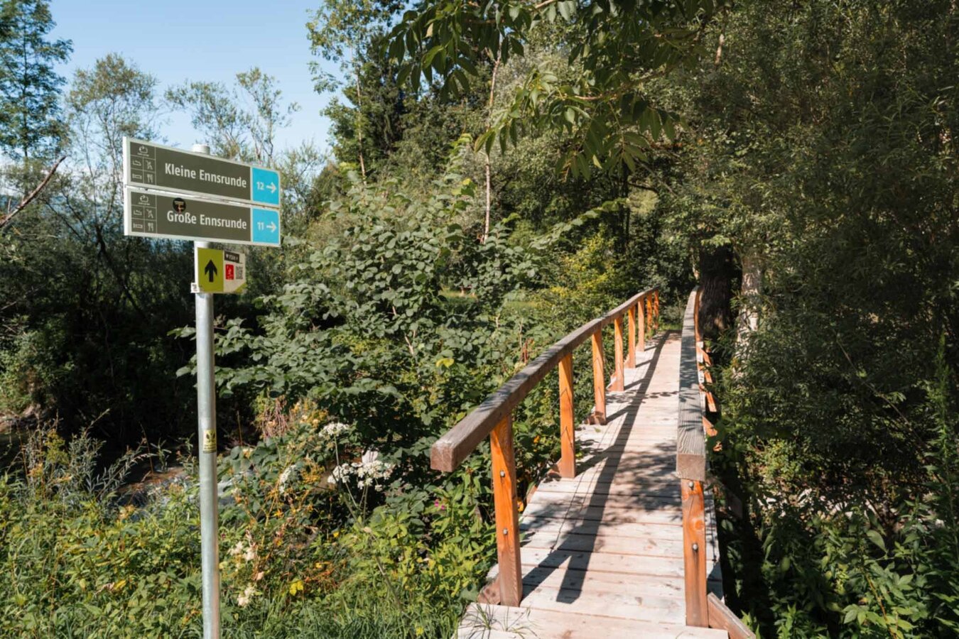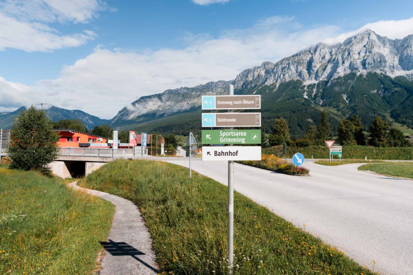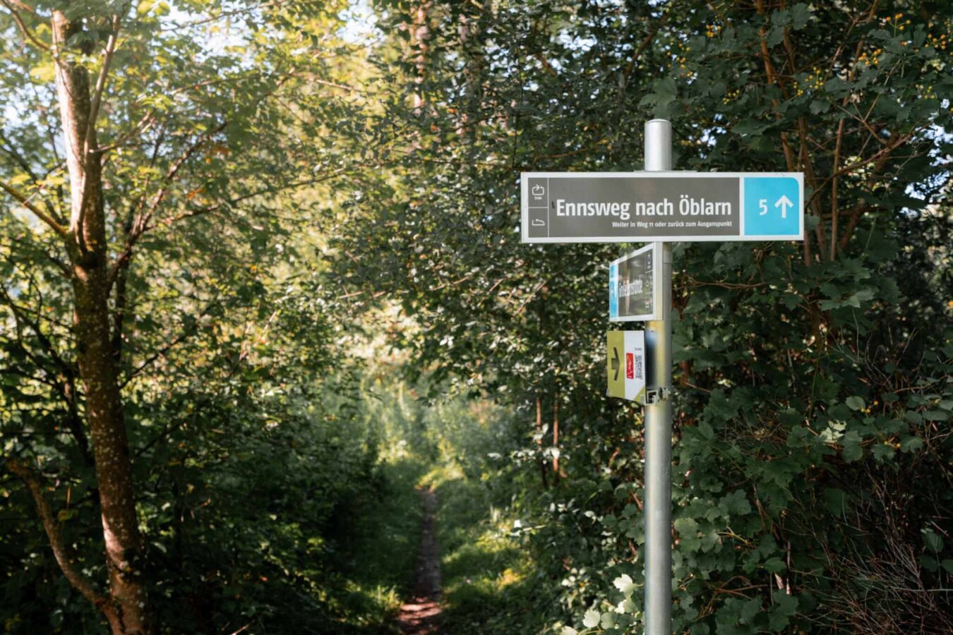 Sonnberg road to the junction to the left - gravel road, downhill to the farm Murberger and downhill to Niederöblarner road - direction Öblarn, after 100 m turn right, cross the railway track and the country road, continue to Enns, upstream along the Ennsuferweg.