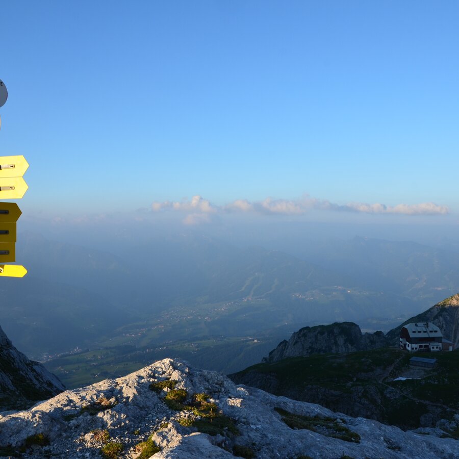The tour begins at the Guttenberghaus, which you can reach either via the previous stage from the Dachstein glacier, or via a direct ascent from the Hotel Feisterer in Ramsau.