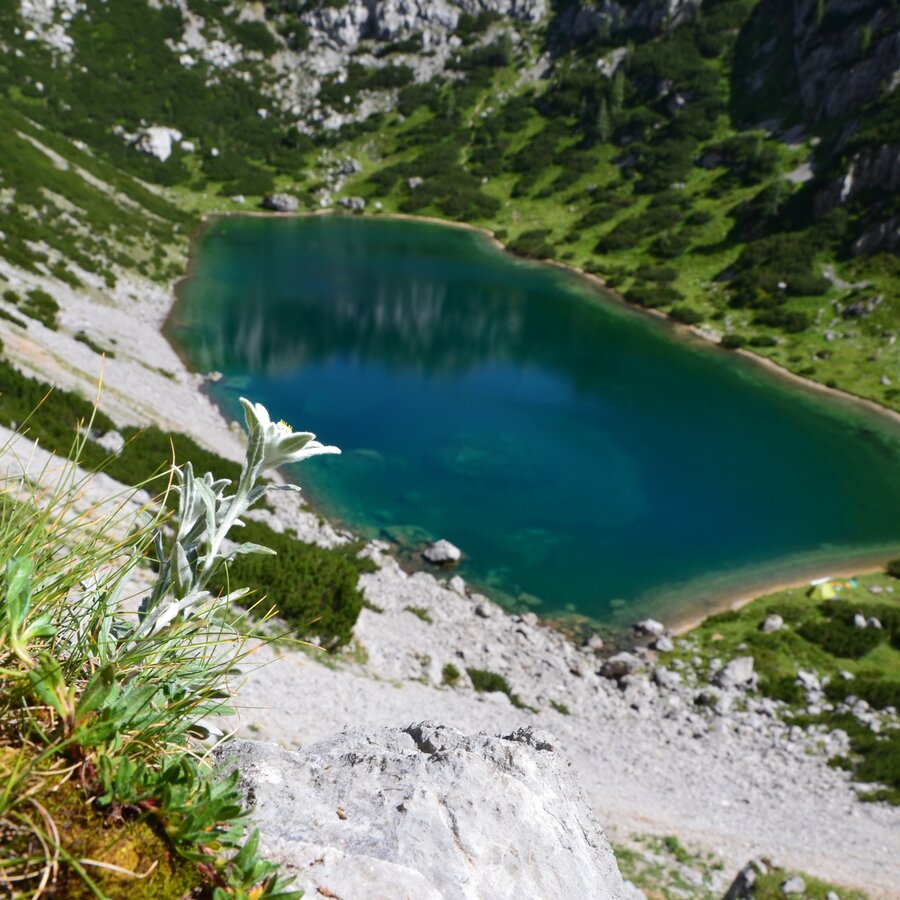 After spending the night in the Guttenberghaus, a beautiful high-altitude hike awaits you with an attractive view down to Ramsau and the Schladminger Tauern. From the Feistererscharte, path #618 first leads east on the north slope of the Sinabell as a pleasant climb. After a good hour's walk, coarse boulders and the wild landscape above the Hölltal dominate. A surprising sight is the Hölltalsee, far below, with its emerald green sea eye. A narrow path leads down to the lake.