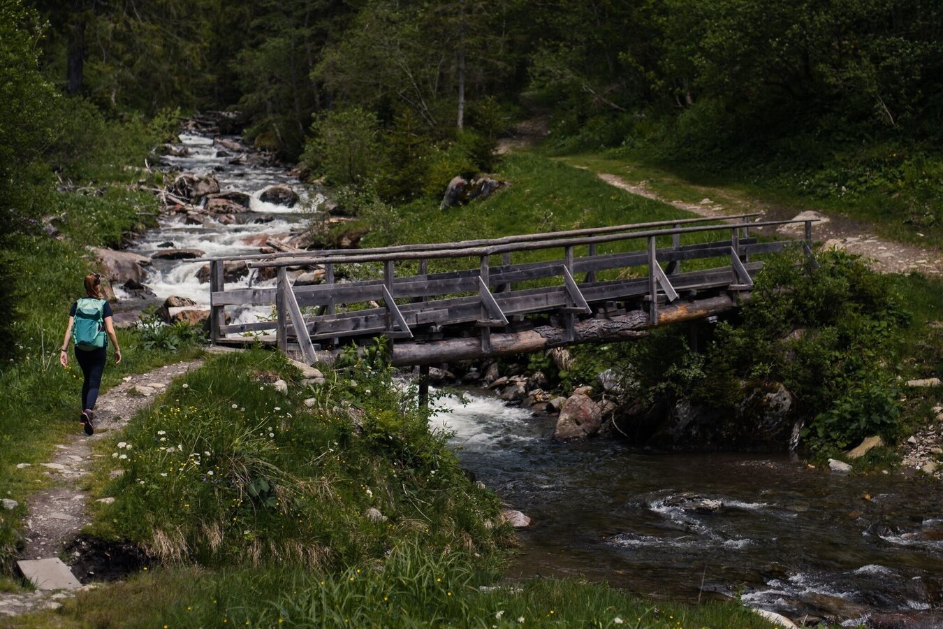 THOUSANDS OF GREENS are bestowed upon you here when you hike along the babbling brook, through the forest and over bridges. Out of the last piece of forest, the wide alpine landscape opens up to you and you can already see the managed huts. Here everyone is happy - cows, pigs, rabbits. And the dairymaid? She serves you the finest alpine delicacies.