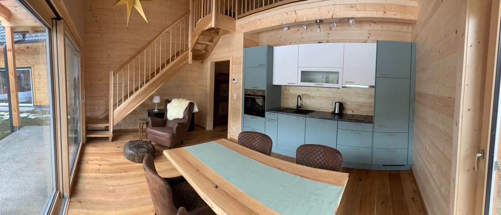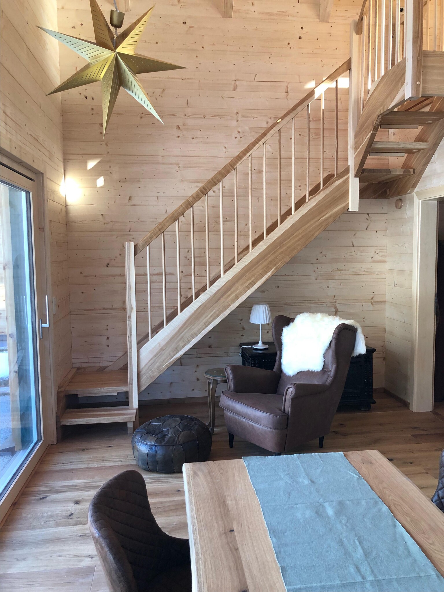 On the ground floor, there is the bedroom, bathroom with shower, WC, storage room for skis and ski boots, and the very well-equipped living kitchen with a comfortable armchair. A narrow staircase leads up to the spacious gallery with exposed roof beams, where you will find a comfortable sofa, as well as beds for up to 4 additional people.