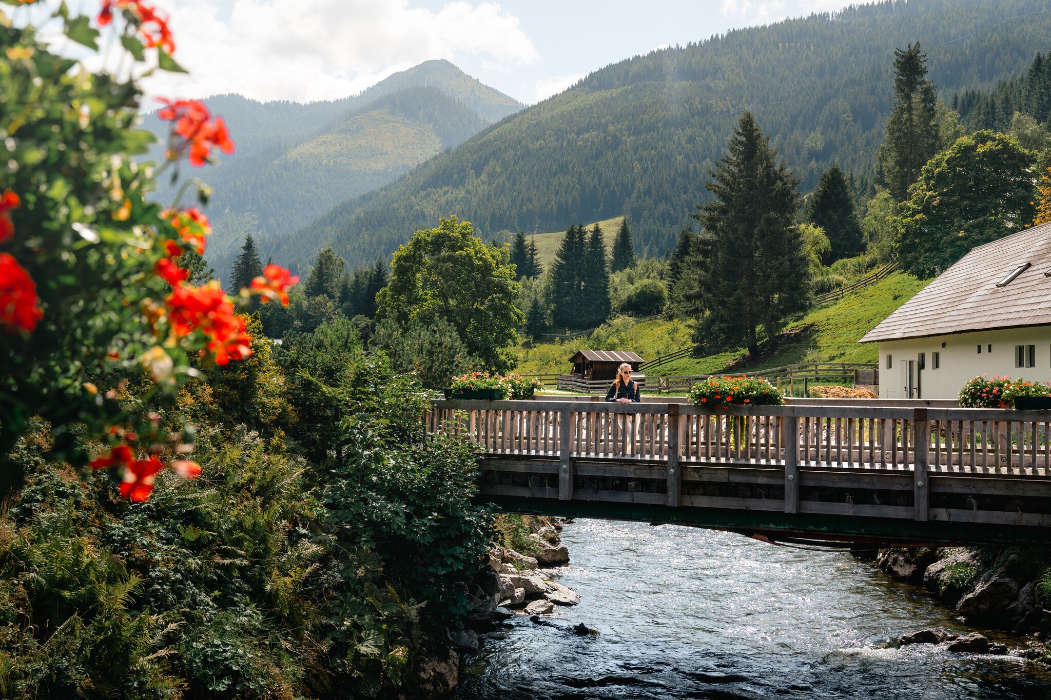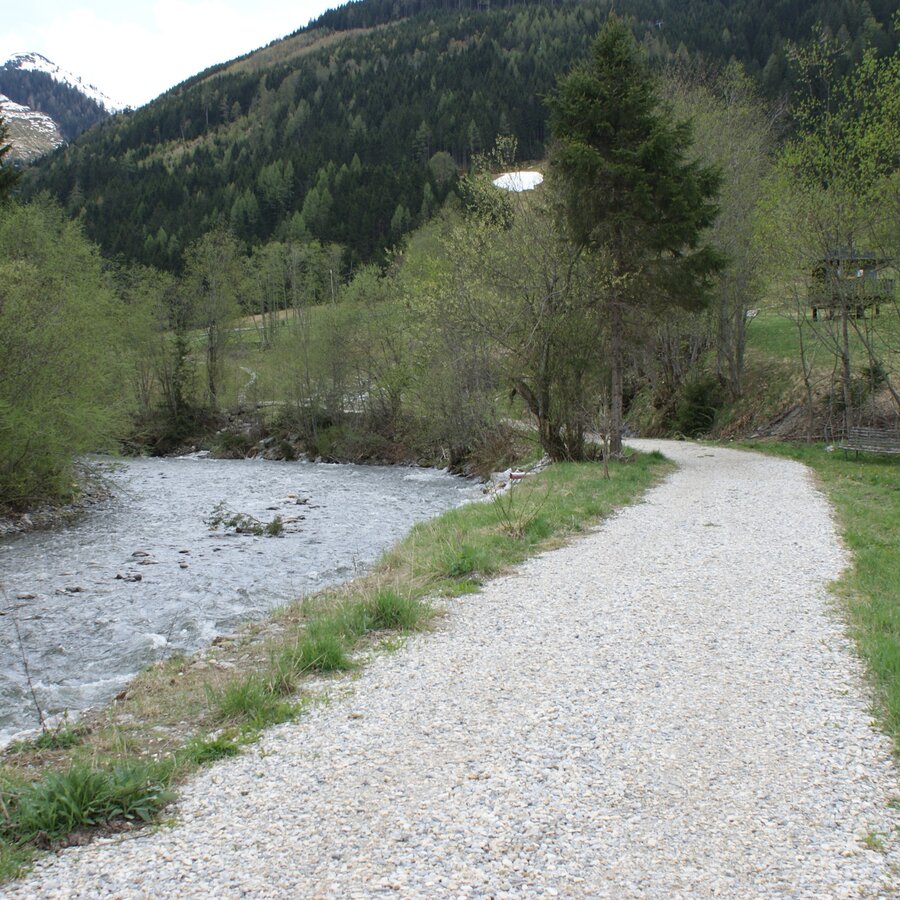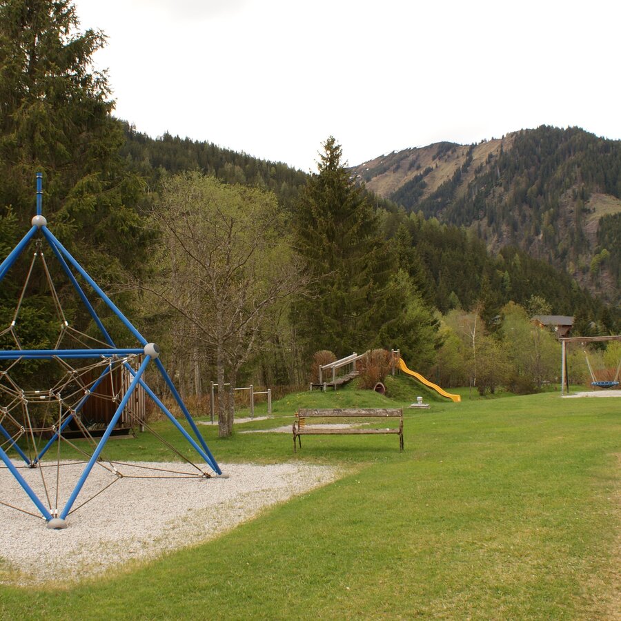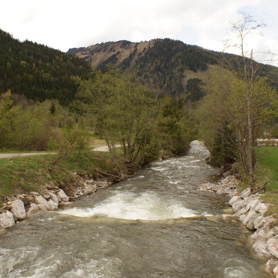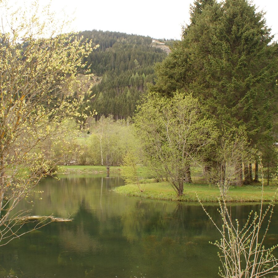 Cross the bridge and then immediately turn left, pass a stable and a paddock and continue straight on along the stream until you reach the large car park of the Riesneralm. Turn left over the bridge and keep going straight back towards the centre of the village. On the way back, you will find the Donnersbachwald recreational area on the left-hand side with a swimming pond, beach volleyball court, children's playground and biotope.