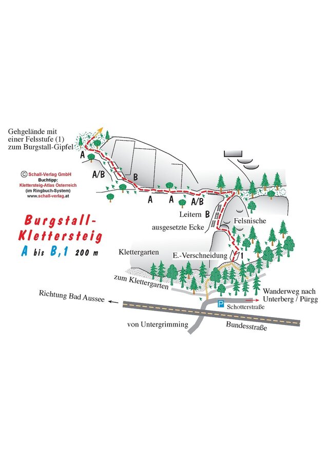 On the B 320 to Trautenfels there enter the traffic circle and take the exit B 146 in the direction of Salzkammergut. After 500 meters turn left to the village Untergrimming. Immediately after entering the village, follow an access road on the right (signs: "Klettergarten").