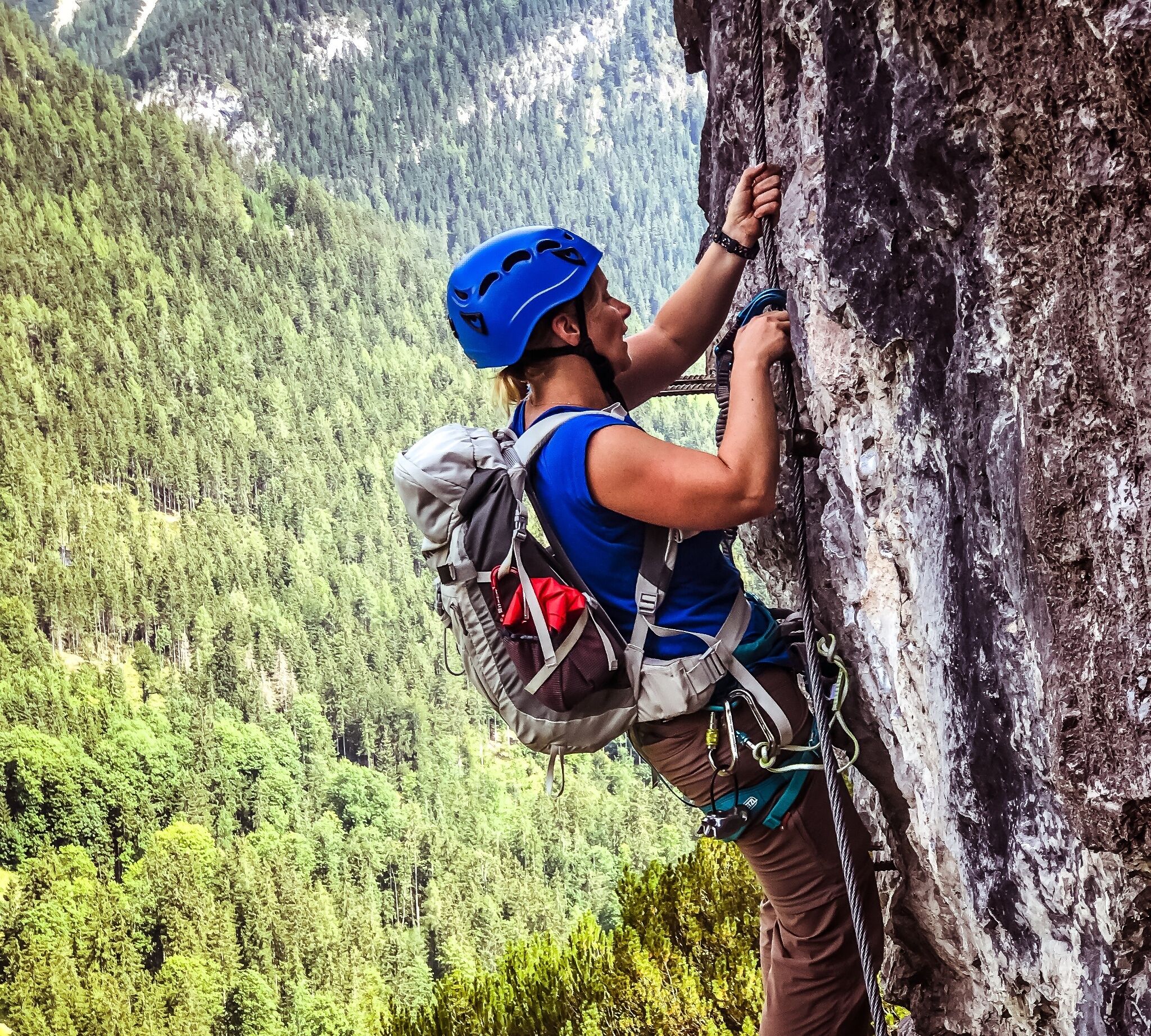 The highlight towards the end of your ascent is the rope bridge which will lead you to the Via Ferrata Kala. From there you will have impressive views of the Sattelberg Plateau.