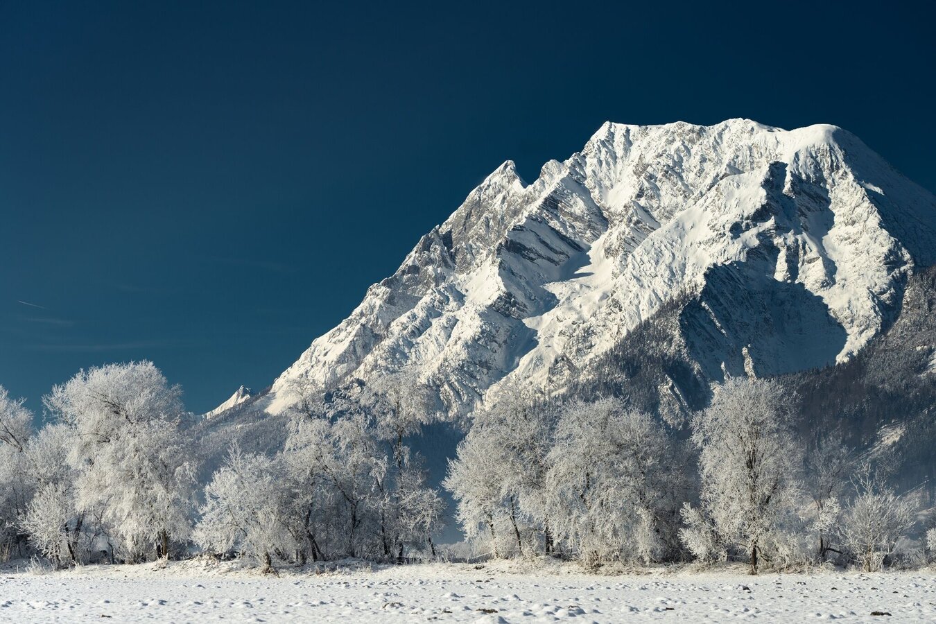 On the way with eagle eyes: On sunny days you can easily recognize the "Grimmingmandl" (as a hiker on the right on the front of the mountain) on the sugared Grimming.